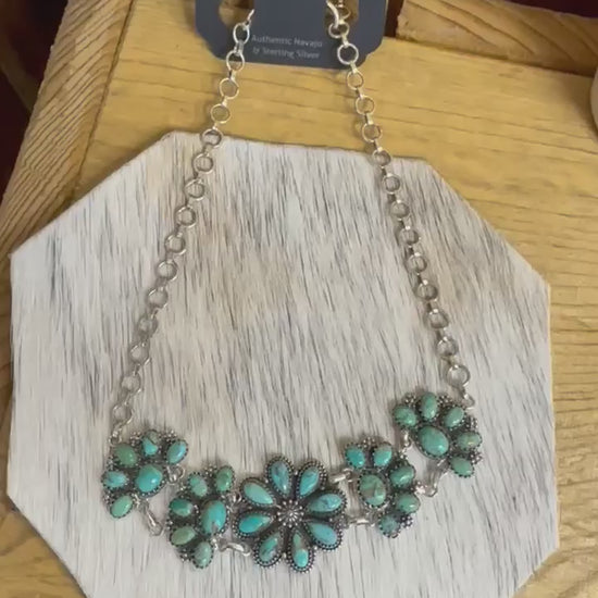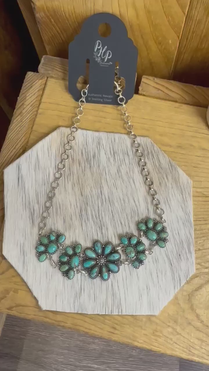 This choker can be any length up to 16.5" Super Stylish and we love the center flower and half clusters. The classic Kingman turquoise will always be in style.