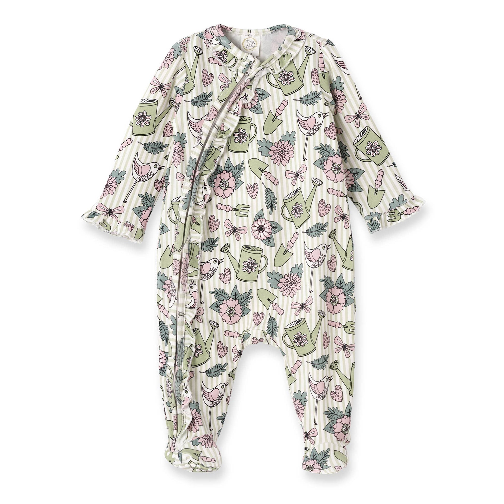 Our ultra-soft zipper romper, adorned with flowers, watering cans, birds, trowels, and more, is crafted from a luxurious blend of bamboo, cotton, and spandex. Featuring a convenient 2-way zipper for effortless dressing and a neck guard for added protection, this romper is both practical and cozy. Little ones will look adorable and feel comfortable in our absorbent, hypoallergenic, eco-friendly, and sweat-resistant style. Easy care: machine wash warm, tumble dry low.
