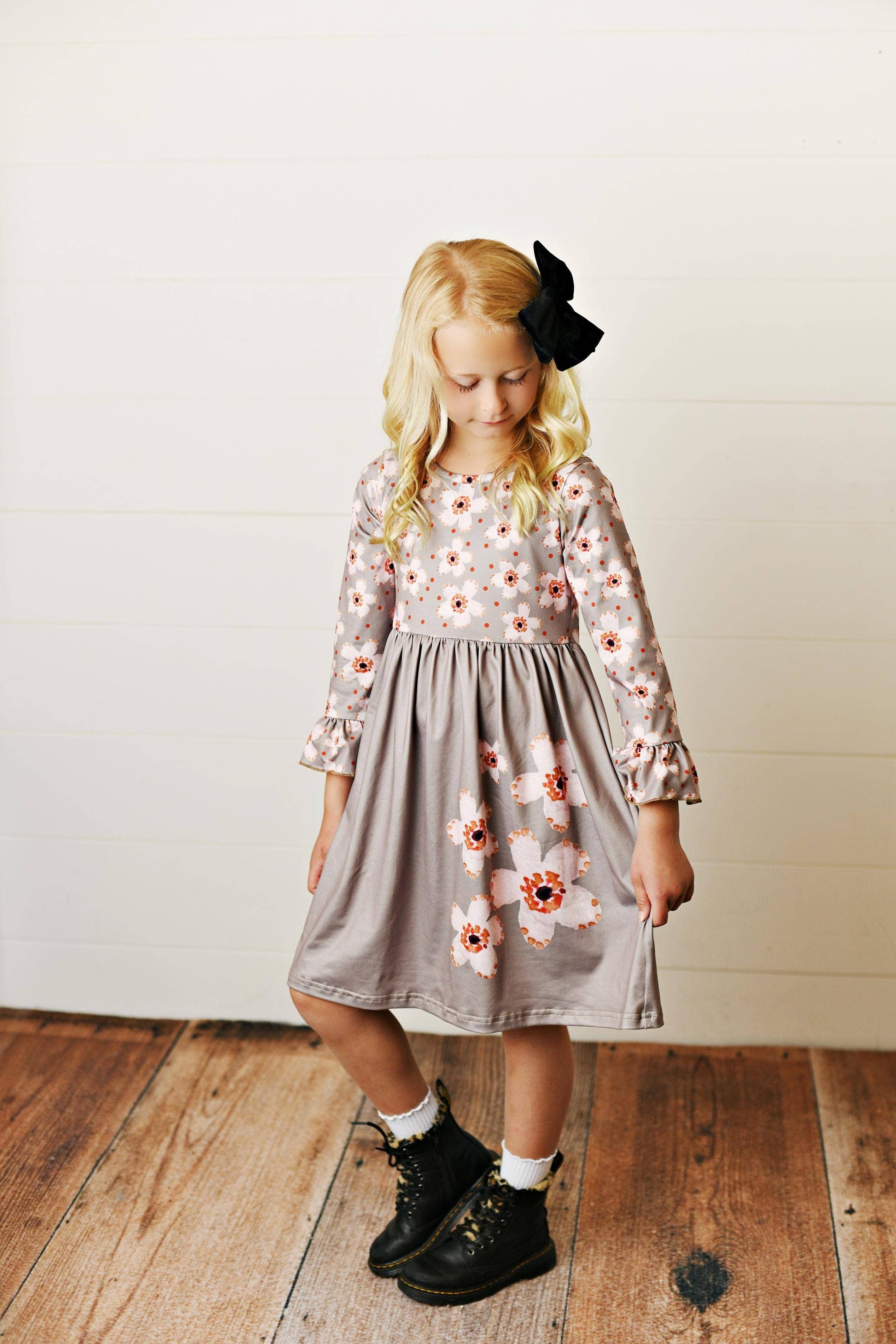 Girls beige & coral Floral print long sleeve twirl dress with ruffle sleeve detail. Perfect for back to school!
